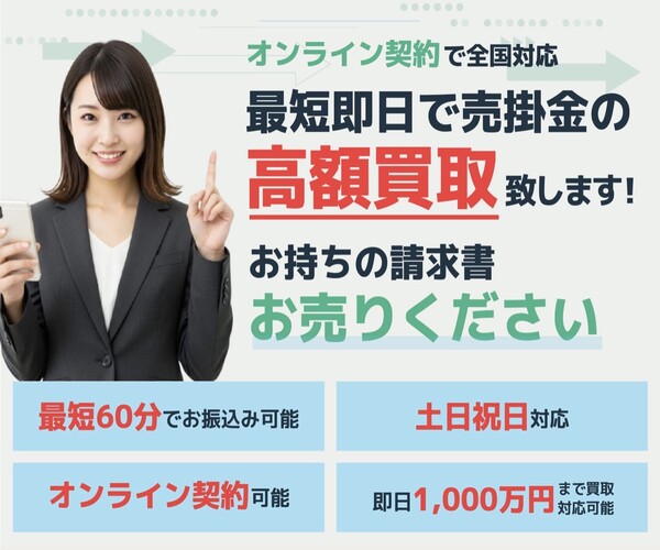 (1)お電話で貴社の事業内容のお伺い。 (2)仮審査 (20分) (3)書類を写真、PDF等で添付。 (免許証、通帳、請求書等) お手元に有るものからご送付下さいますと、審査が早まります。 (4)本審査(30分) 結果はお電話にてお伝えします。 (5)契約(10分) クラウドサイン(オンライン)で契約確認後、指定口座にお振込み。 ご利用者様の資金繰り改善を第一に考えた手数料を設定しており、下限5%〜となっております。 ソクデルでは専任担当制を採用しており、専任担当者の柔軟な審査が好評です。 他社でお断りされてしまった場合はもちろん、赤字決算や税金分納でもご利用頂けるケースが多くなっています。 Googleでの口コミでも大変評価が高く、その内容や件数は数あるファクタリング会社の中でも上位であると自負しております。 ご利用者様が気にされる部分でもある契約方法に関しては来店・出張・オンラインとお選びいただけます。 ご利用者様の所在地やご予定に合わせることが可能となっております。